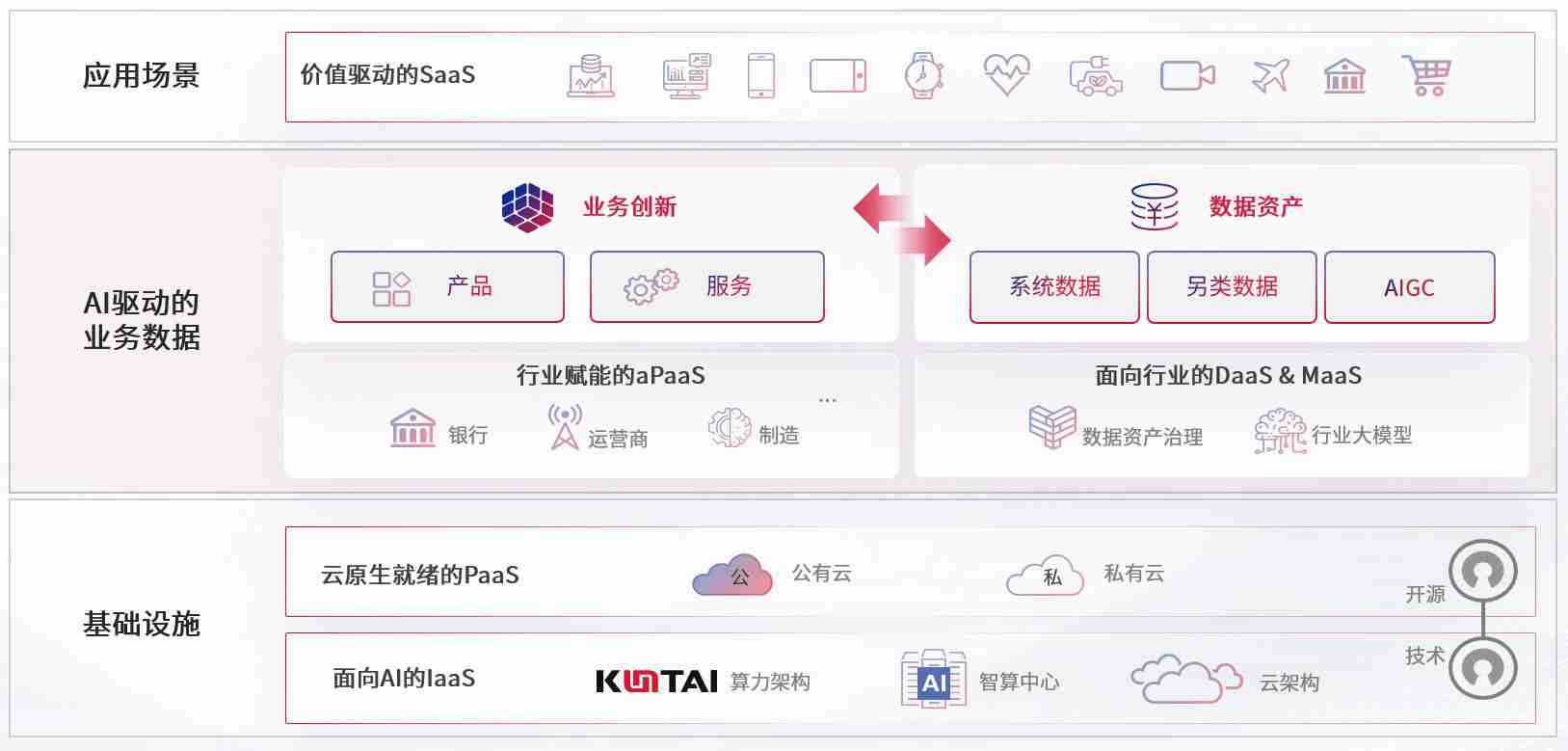 数字时代,,,,围绕企业数字化转型的关键要素,,3499拉斯维加斯数码开创性的提出数云融合战略和技术体系框架,,,,着力在云原生、、、数字原生、、AI原生和信创产业上架构产品和服务能力,,,为处在不同数字化转型阶段的快消零售、、、、汽车、、、金融、、、、医疗、、、政企、、教育、、、、运营商等行业客户提供泛在的敏捷IT能力和融合的数据驱动能力,,构建跨界融合创新的数字业务场景和新业务模式,,,助力企业级客户建立面向未来的核心能力和竞争优势,,全面推动社会的数字化、、智能化转型升级。。。。